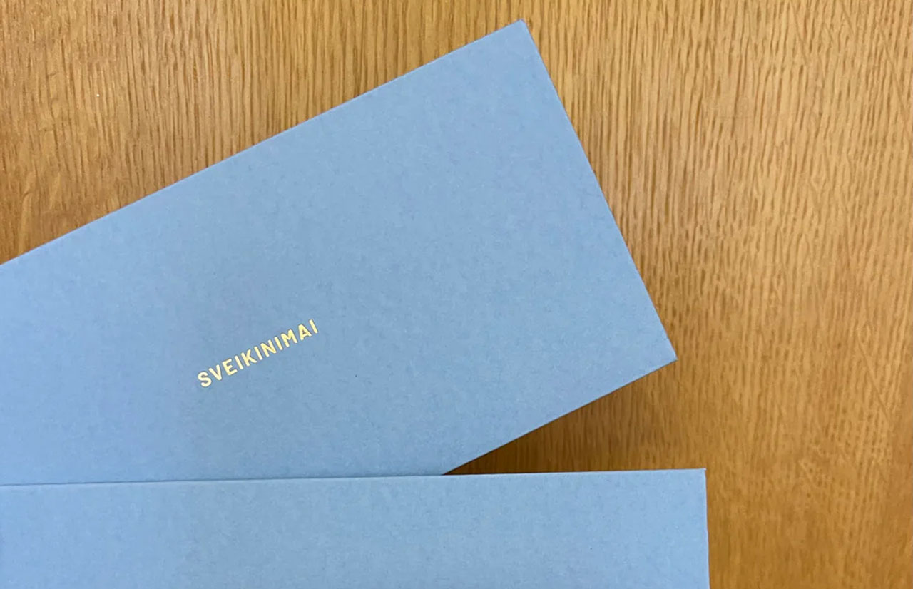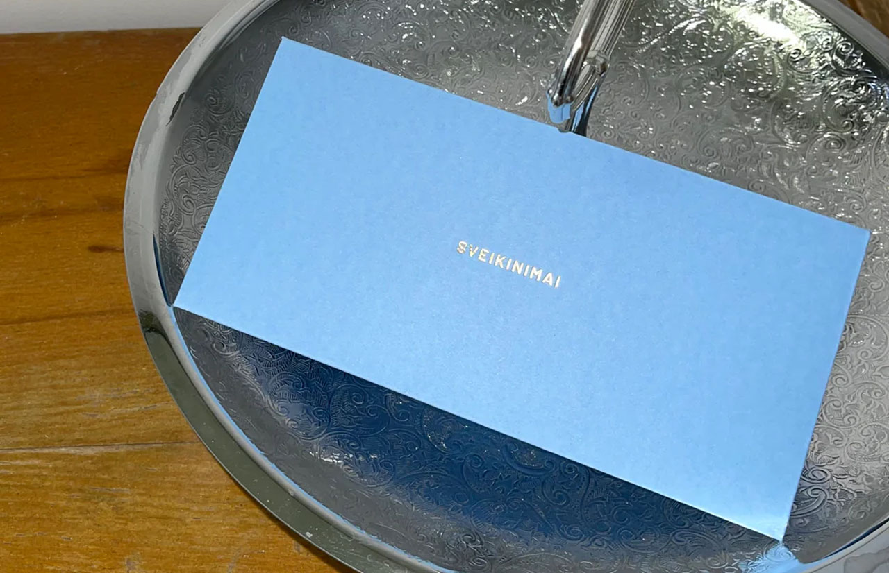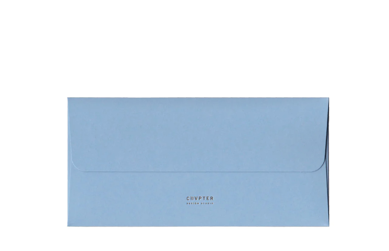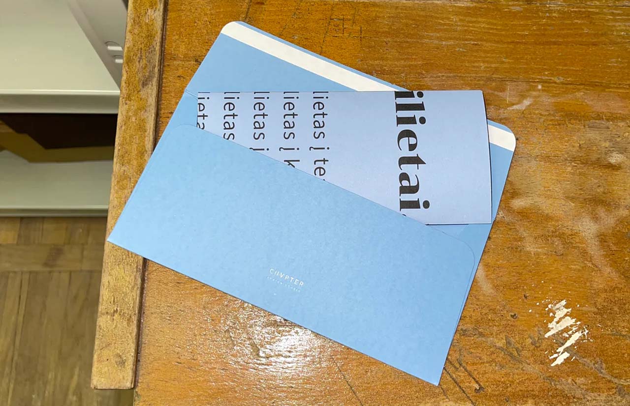 SS'24 kolekcijos vokas, pagamintas iš kruopščiai atrinkto bordo matinio, melsvo matinio arba Brilliant white matinio popieriaus su aukštos kokybės folijavimo spauda.