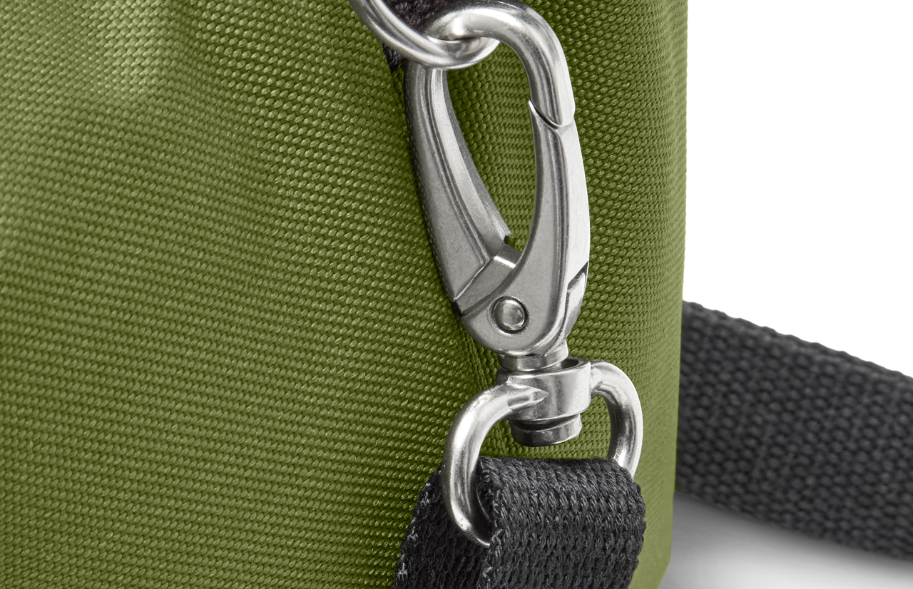 „Dry bag“ įkvėptas dizainas: susukamas viršus ir suvirinta vidinė danga sukuria 100 % sandarų uždarymą, kai krepšys laikomas vertikaliai