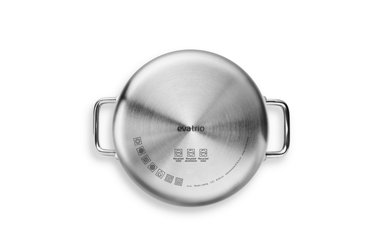• Puodo korpusas pagamintas iš 100 % perdirbto po vartojimo surinkto aliuminio ir 90 % perdirbto po vartojimo surinkto nerūdijančio plieno