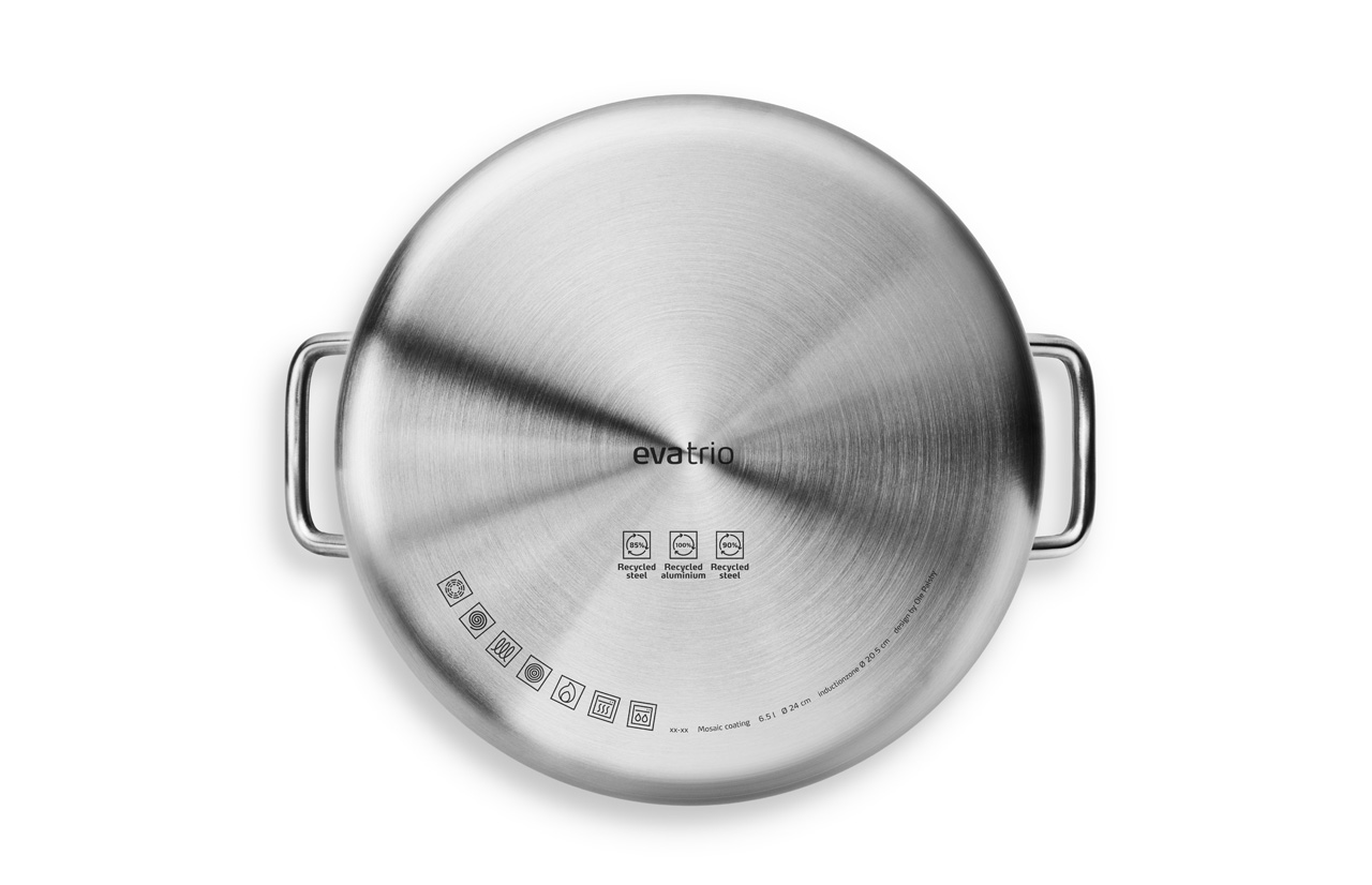 - Remiamas klasikiniu Ole Palsby / Eva Trio dizainu: šalto nerūdijančio plieno rankenos, pylimo lūpa, galimybė slegti ir suderinti su kitais Eva Trio dangčiais bei indais