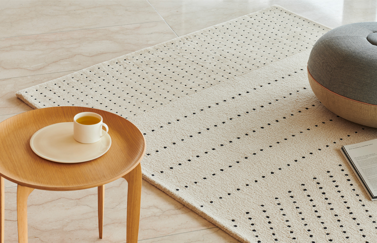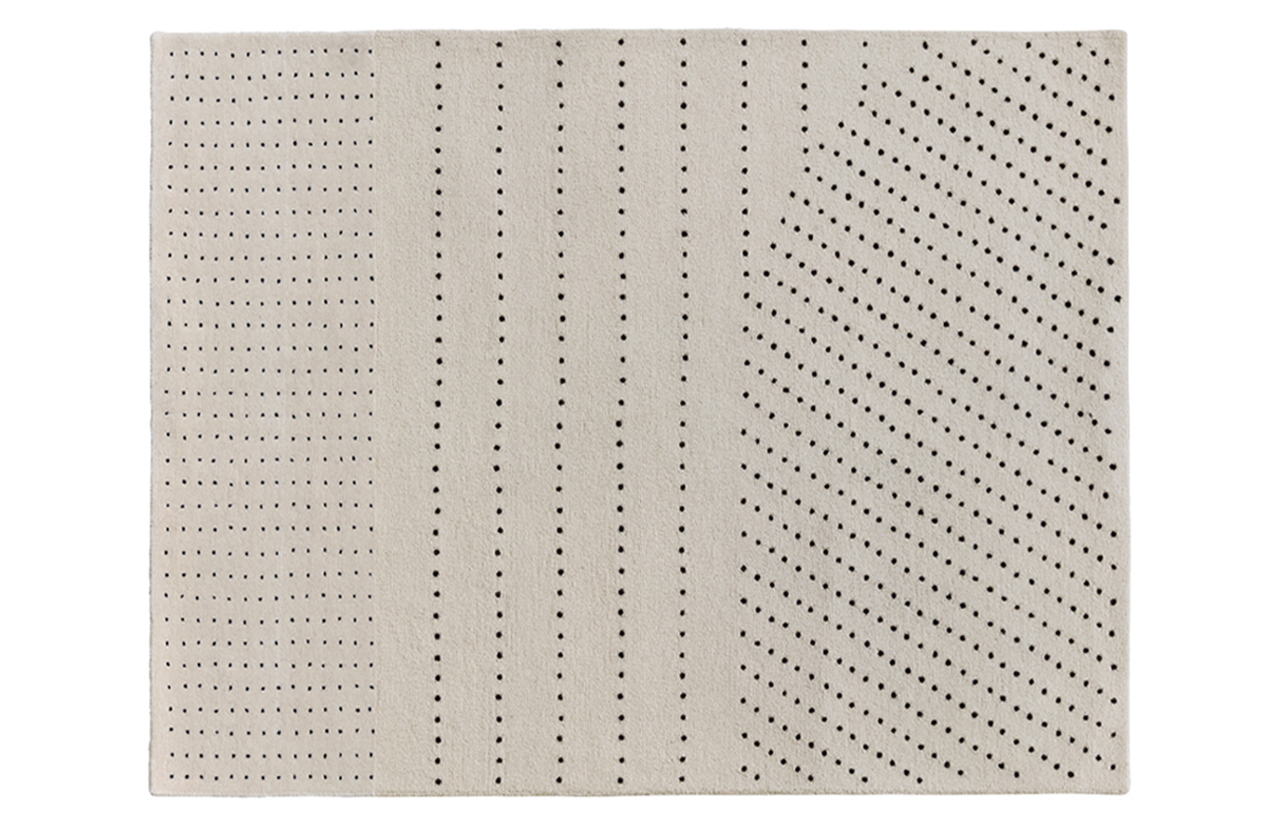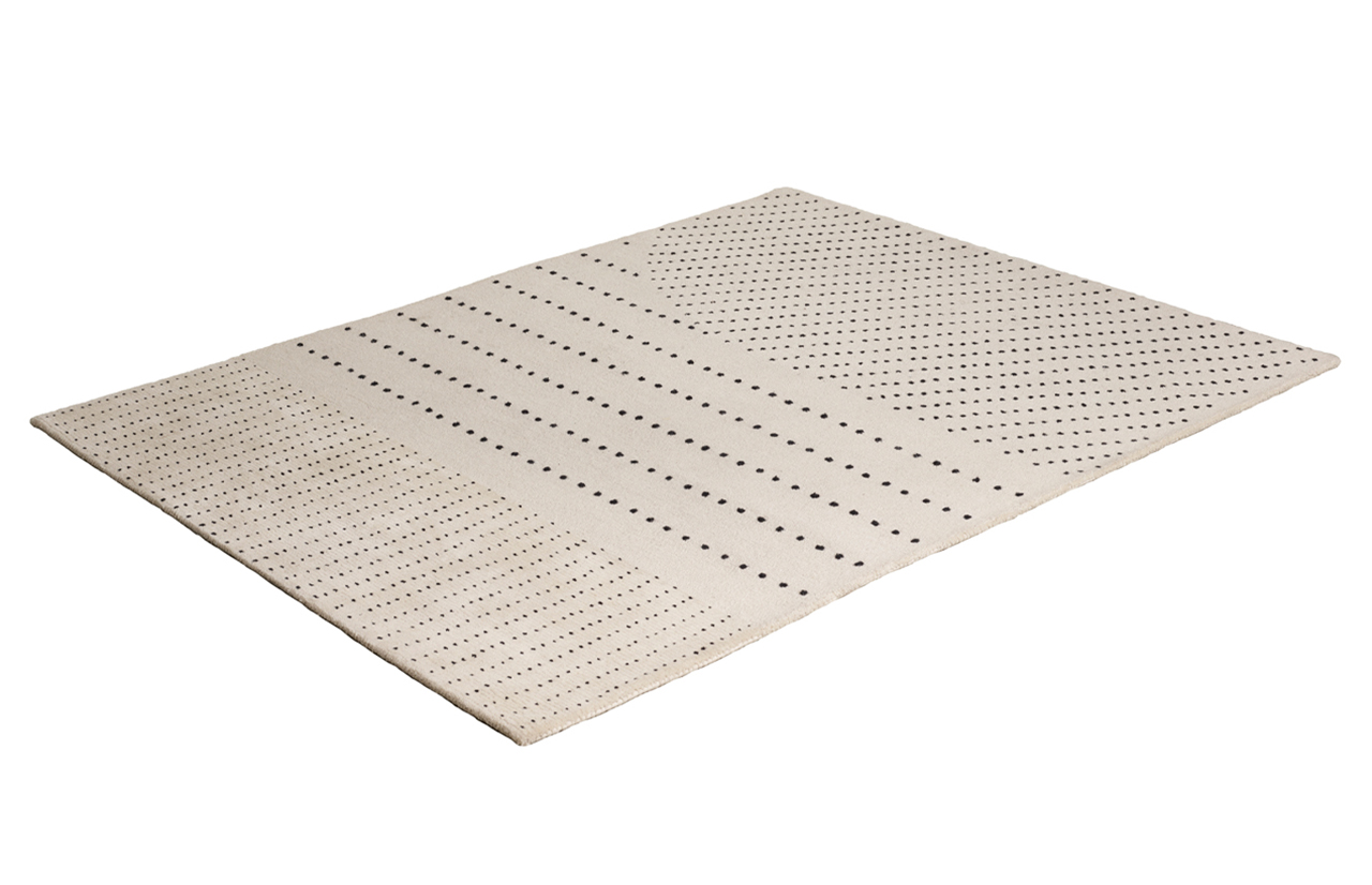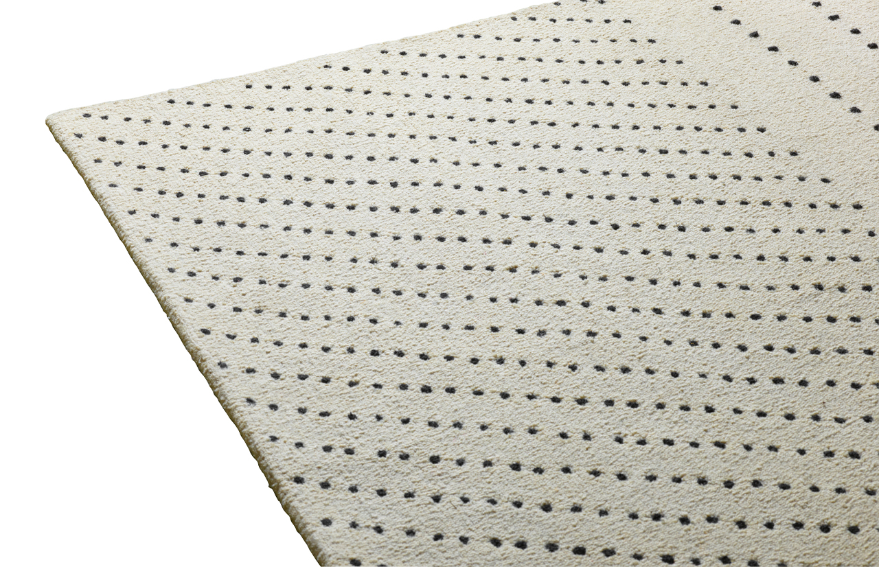 DOTS kilimo dizainą puošia iš juodų taškų komponuojamas piešinys. Skirtingas taškelių tankis sukuria vizualią dinamiką bei darnų ritmą.