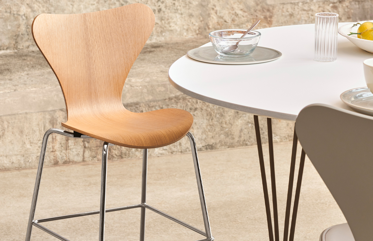 Įgimtas vaikų troškimas mėgdžioti suaaugusiuosius lemia jų vystymąsi ir tobulėjimą, todėl FRITZ HANSEN adaptavo ikoninės kėdės dizainą ir sukūrė SERIES 7 paaukštintą vaikišką kėdę. Ši kiek paaukštinta versija leidžia vaikams patogiai įsitaisyti prie pietų stalo bei jaustis lygiaverte šeimos dalimi. Jaukus ąžuolo ir chromo spalvinis duetas alsuoja jaukumu bei neįpareigojančiu charakteriu.