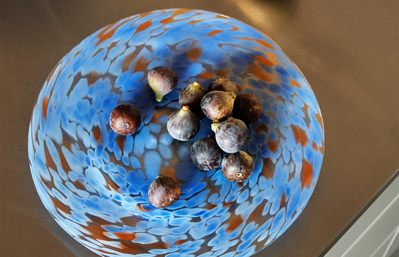 Rankų darbo SPLASH lėkštė gaminama iš spalvotojo stiklo. Speciali stiklo pūtimo technika leidžia sukurti originalų, žaviai chaotišką spalvų sūkurį, kuris ir tampa šios kolekcijos stilistine šerdimi. Intensyvūs mėlyni atspalviai dizainui suteikia išskirtinumo, lėkštėje įspūdingai atrodo spalvingi patiekalai ir vaisiai.