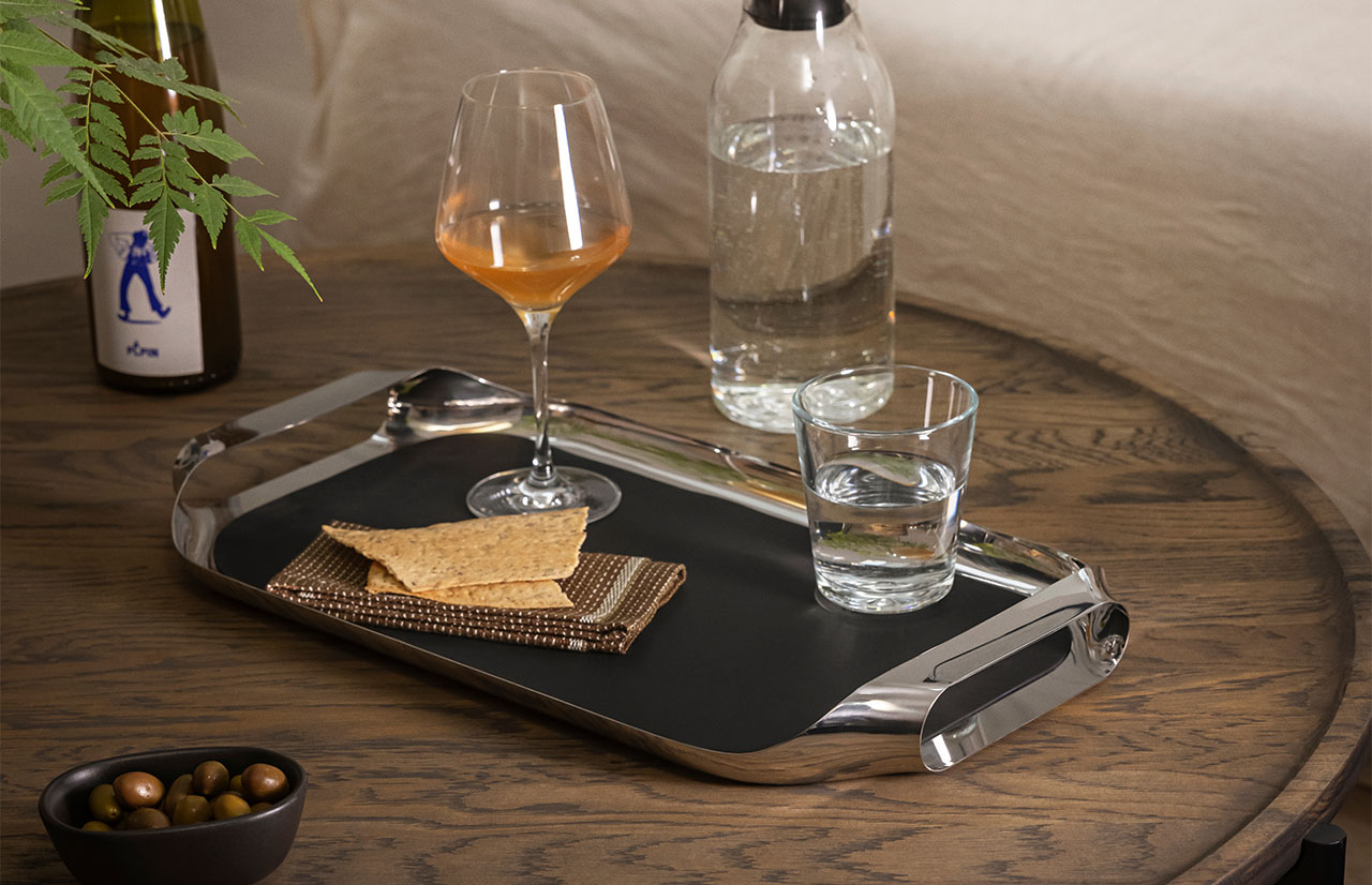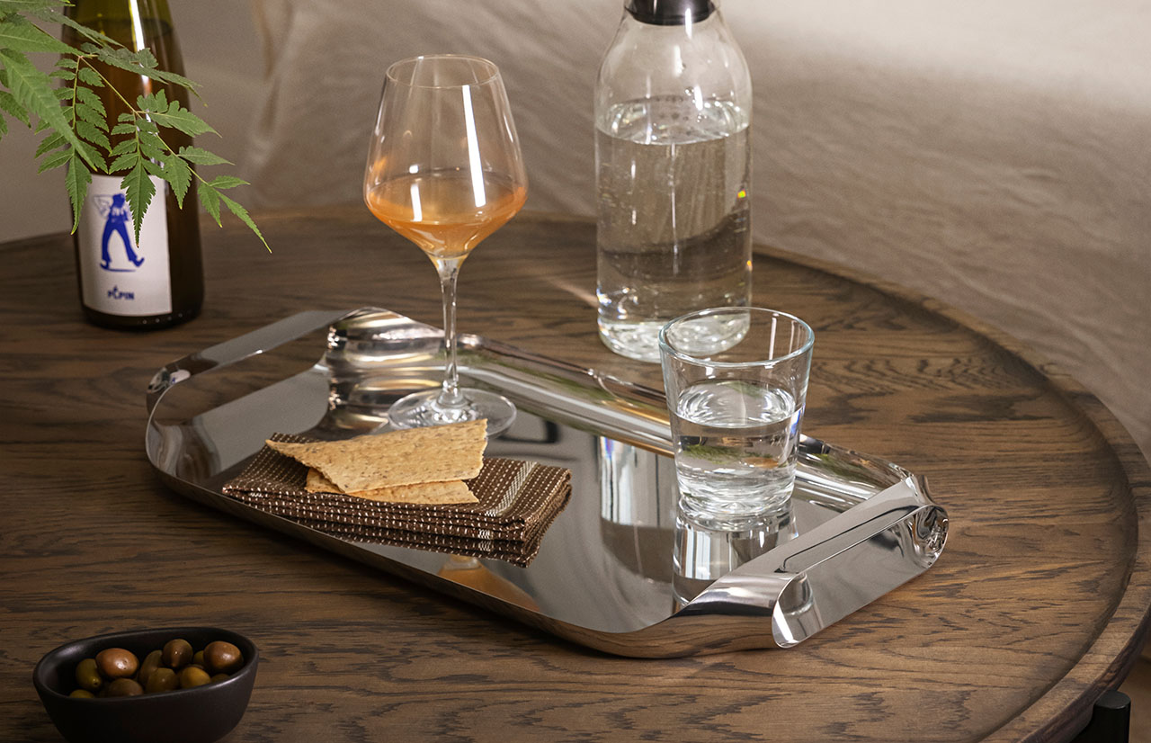 Šis elegantiškas serviravimo padėklas suteikia išskirtinį stilių tiek pusryčiams lovoje, tiek gėrimams terasoje. Dailios linijos išgaunamos iš vieno plieno lakšto, todėl suvirinimo siūlės nėra matomos. Dėl kompaktiško, plokščio dizaino jis lengvai telpa daugelyje virtuvės stalčių. Be praktiškos paskirties serviruojant, padėklas taip pat tampa stilinga interjero detale – puikiai tinka dekoracijoms, žvakidėms ar skintoms gėlėms eksponuoti. Prie šio padėklo galima atskirai įsigyti specialiai jam pritaikytą silikoninį serviravimo kilimėlį.