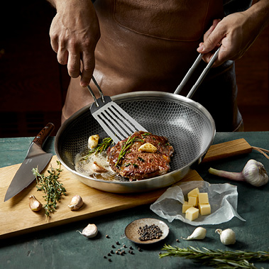 Slip-Let® is triple-layered, ensuring exceptional durability and reliability. What are the benefits of this coating? The non-stick, slippery surface allows you to significantly reduce the amount of fat used, or even eliminate it entirely. This makes the pans easier to maintain, as food does not stick, and they are extremely easy to clean.
