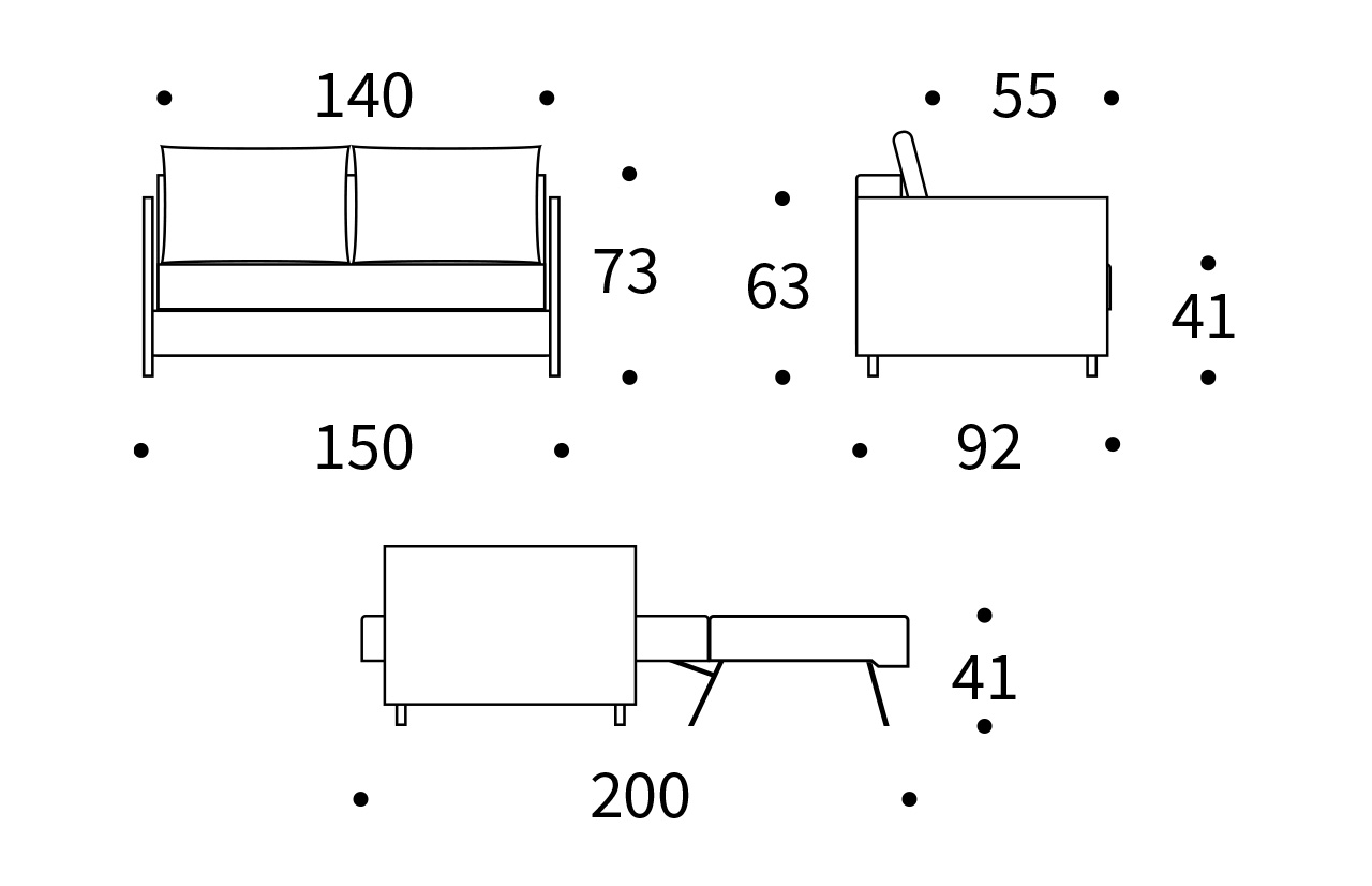| Dimensions: | height 80 cm, length 150 cm, seat H 41 cm, width 90 cm |