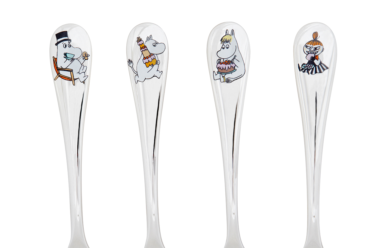 This set comprises four spoons adorned with illustrations of Moominvalley heroes: Moominpappa, Moomin, Snork Maiden, and Little My. Artist Tove Slotte crafted these exquisite illustrations based on the original drawings from Tove Jansson's books. The spoons are stainless steel and dishwasher safe.