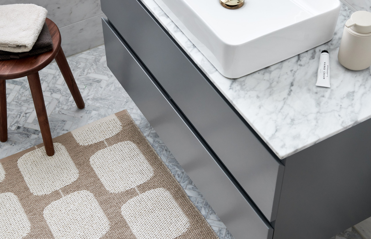"Pappelina" rugs can be cleaned with a cloth, hand-washed, or machine-washed in water not exceeding 30 degrees (avoid spinning or tumble drying). Stretch the rug firmly while damp to restore its shape, allow water to drip off, and air dry. Handle the edges with care. Wash dirt away, don’t rub.