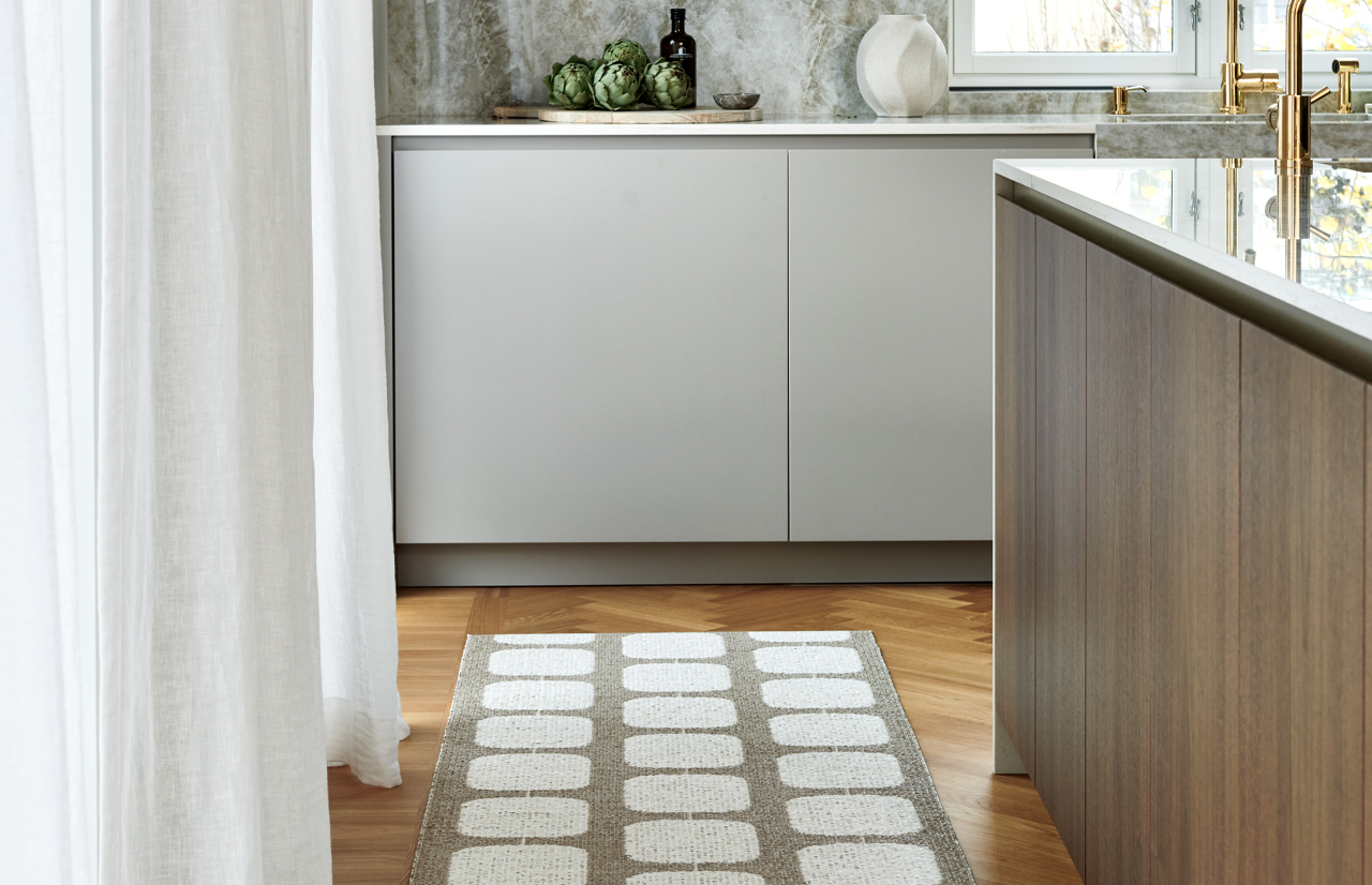 Distinct and contemporary, Pappelina's Swedish rugs and upholstered furniture are produced under strict environmental guidelines, boasting simple, functional design and outstanding quality. Unusual yet practical, "Pappelina" rugs are crafted from soft, non-toxic plastic and hand-woven in Sweden using traditional looms. These rugs, although soft, are perfect for high-traffic areas, both outdoors and indoors – in the hallway, kitchen, or terrace. These stunning, glossy rugs are designed for use on both sides.Materials: