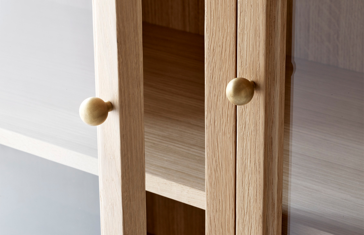 | Material: | brass handles and hinges, glass, oak plywood, solid oak |